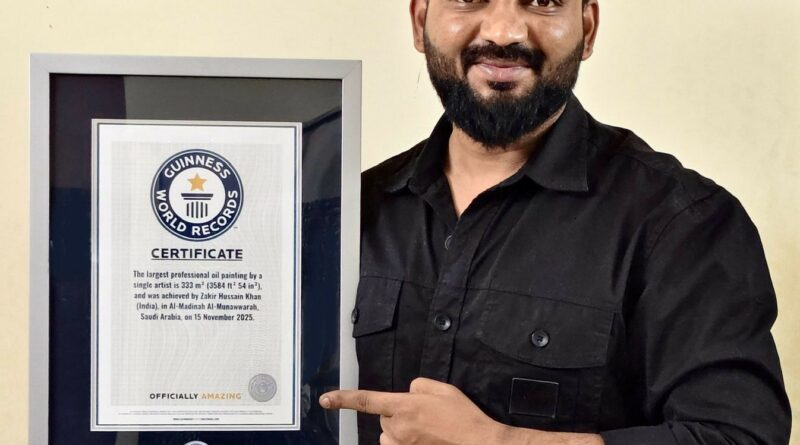 In addition to this milestone, Zakir Hussain Khan also achieved the Guinness World Record for the largest professional oil painting by a single artist, measured at 333 square meters (3584 ft² 54 in²). This prestigious record was officially recognized on 15 November 2025 in Al-Madinah Al-Munawwarah, Saudi Arabia, further cementing his place in global art history.