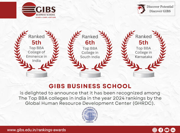 Bangalore, India – GIBS Business School is honored to announce their inclusion among India’s premier Business Administration institutions, according to the Global Human Resource Development Center’s 2024 rankings. This remarkable recognition speaks volumes of GIBS’s dedication and excellence in business education.