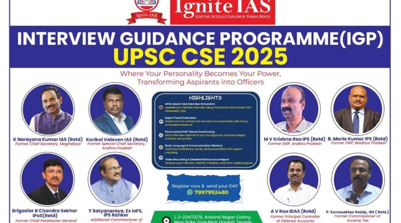 Ignite IAS, one of South India’s most respected and result-oriented civil services coaching institutions, has announced the launch of its Interview Guidance Programme (IGP) for UPSC Civil Services Examination 2025, a comprehensive initiative aimed at preparing aspirants for the final and most decisive stage of the UPSC selection process—the Personality Test. The programme will commence from December 26, 2025, and is designed to help candidates shift their preparation from being knowledge-centric to personality-driven, in alignment with the expectations of the UPSC Interview Board.